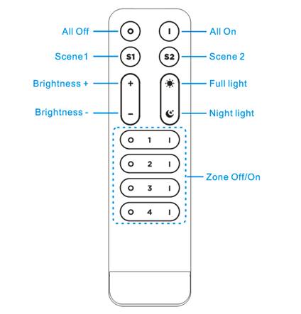 Short press to activate the set scene mode. Scene combination settings (take the S1 button as an example): Step 1: Quickly short-press the S1 button 3 times within 3 seconds. The remote control indicator light will flash slowly automatically, entering the scene setting state. Step 2: Adjust the lights in each area using buttons other than the S1/S2 buttons. Step 3: After adjusting the lights, press the S1 button once again to save. The remote control indicator light will flash quickly 3 times, and the loading lights will "breathe" once, indicating that the S1 scene setting is complete. Note: The entire setting process must be completed within 60 seconds; it will exit automatically if timed out. Or pressing the S2 button to exit the operation without saving if needed. |
