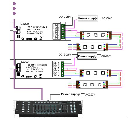 - DMX decoder can be controlled by DMX master, and the decoder can connect the signal line to continue to expand the channels up to 512, eventually be able to achieve more change in effect.